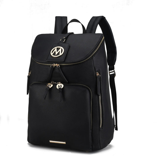 Feature: Design with luxurious gold tone embellishments, balance life's work and leisure moments with the Angela Large Backpack, a versatile high quality smooth vegan leather design, that has a dedicated spot for every necessity with multifunctional pockets and with an interior sleeve locks in your laptop as you commute from a morning workout to a lunch meeting. The exterior zip gives you access to the spacious interior. The Angela Large Backpack has a trolley sleeve in the back, that is one of the most helpful features a bag can have for travel. The Angela Large Backpack has a decorative luggage tag with our signature Mia K round emblem and our plate metal emblem.
