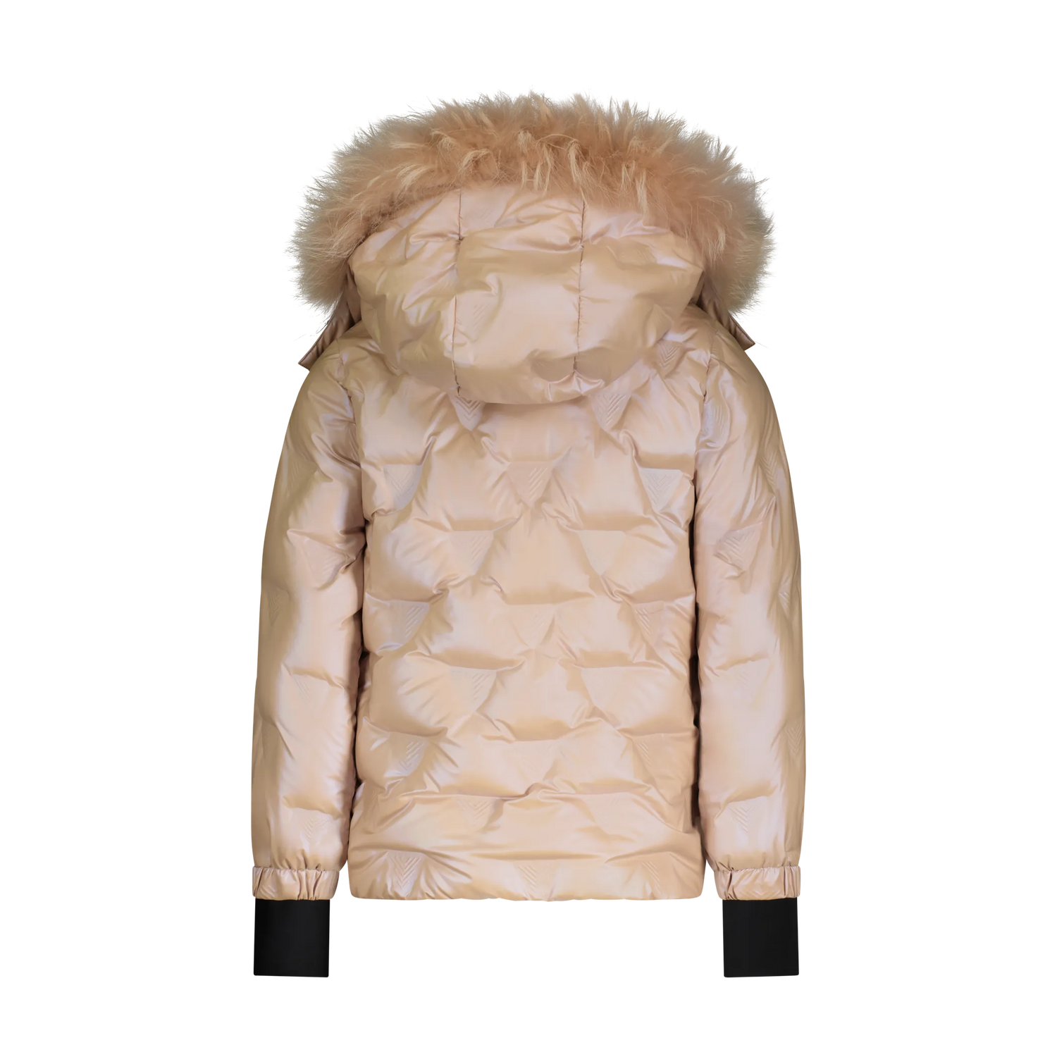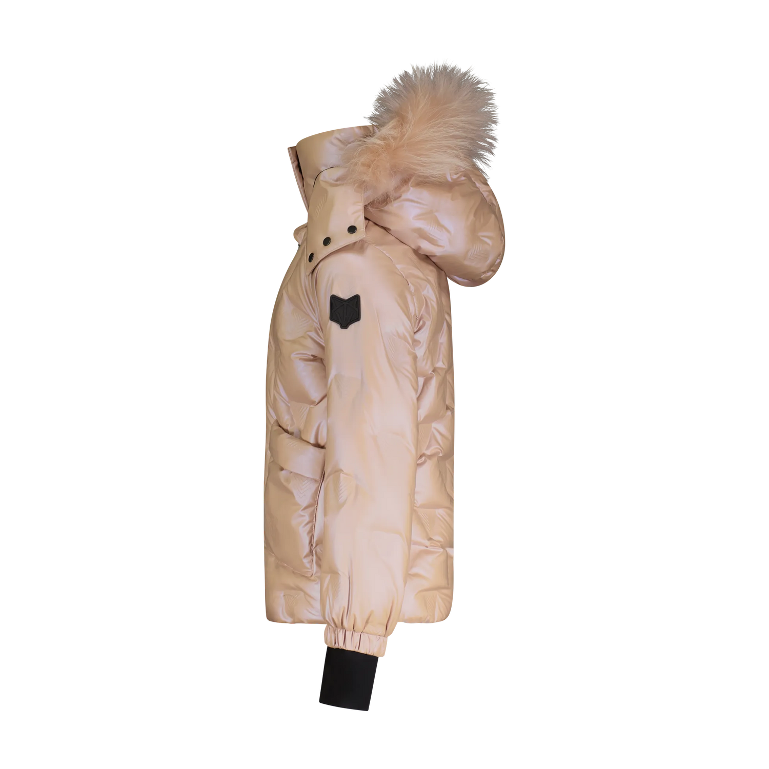 You'll want to head out the door just to be able to slip into this sleek, pink trendsetter piece with a soft racoon collar to keep you warm
