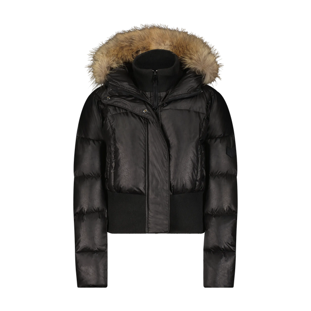 This jewel of a coat features a slightly shiny surface, high elastic collar and a delightful raccoon fur collar
