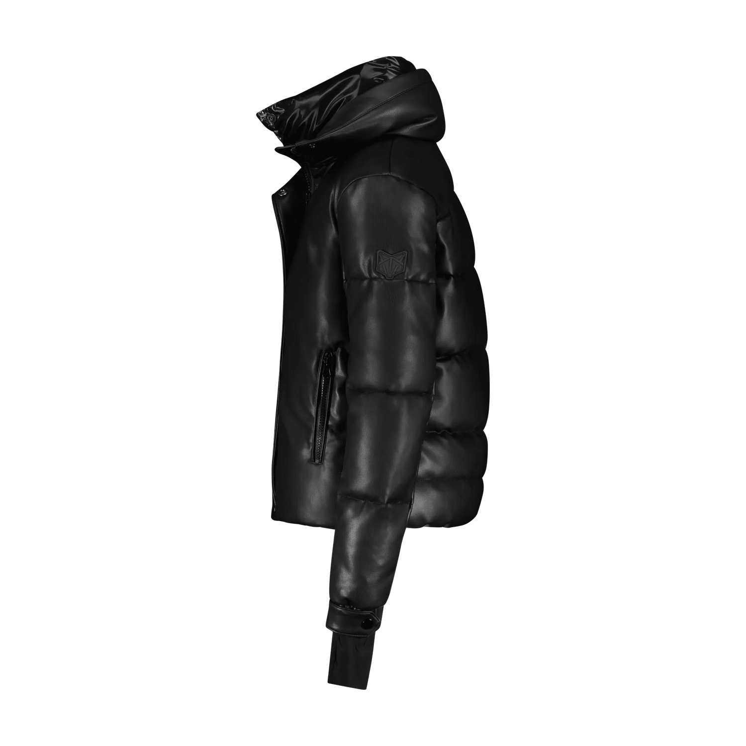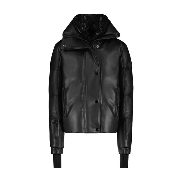 Think ultra-modern rockstar with this faux-leather jacket with a fold down collar and an up to date Greased Lightning look